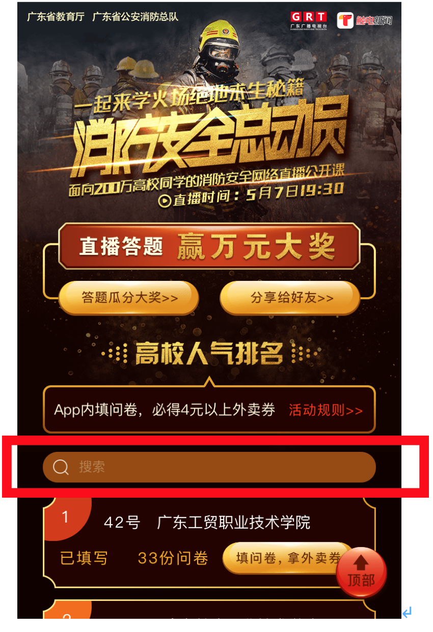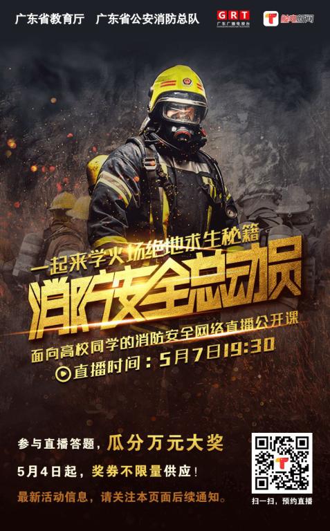2018年5月7日(周一)晚上19:30—21:00,广东省教育厅联合广东省公安消防总队、广东省广播电视台举办全省高校消防安全网络直播公开课活动。届时,将讲授最权威,全面的火场求生秘籍,提升你的消防安全素质和逃生自救能力。